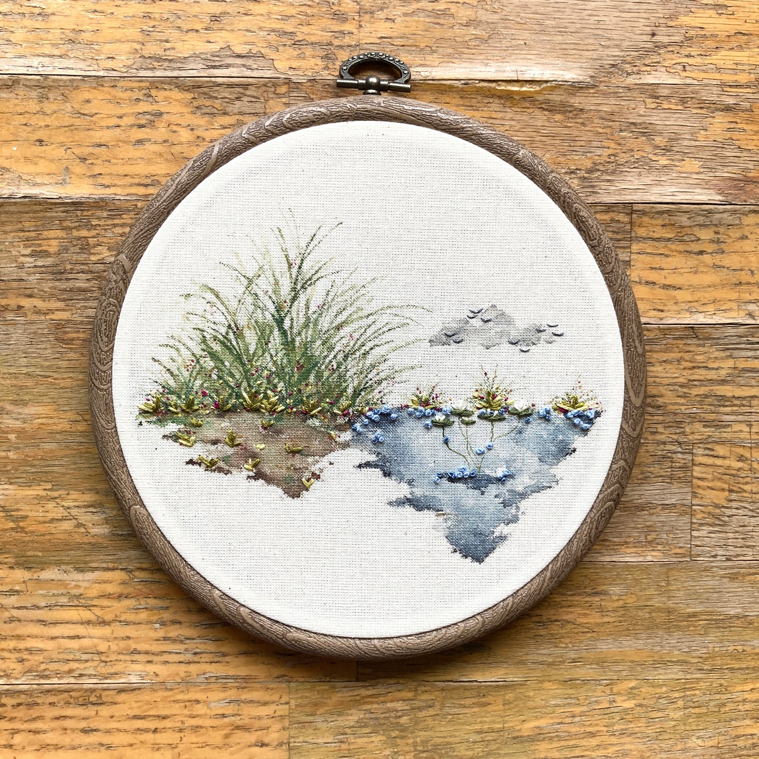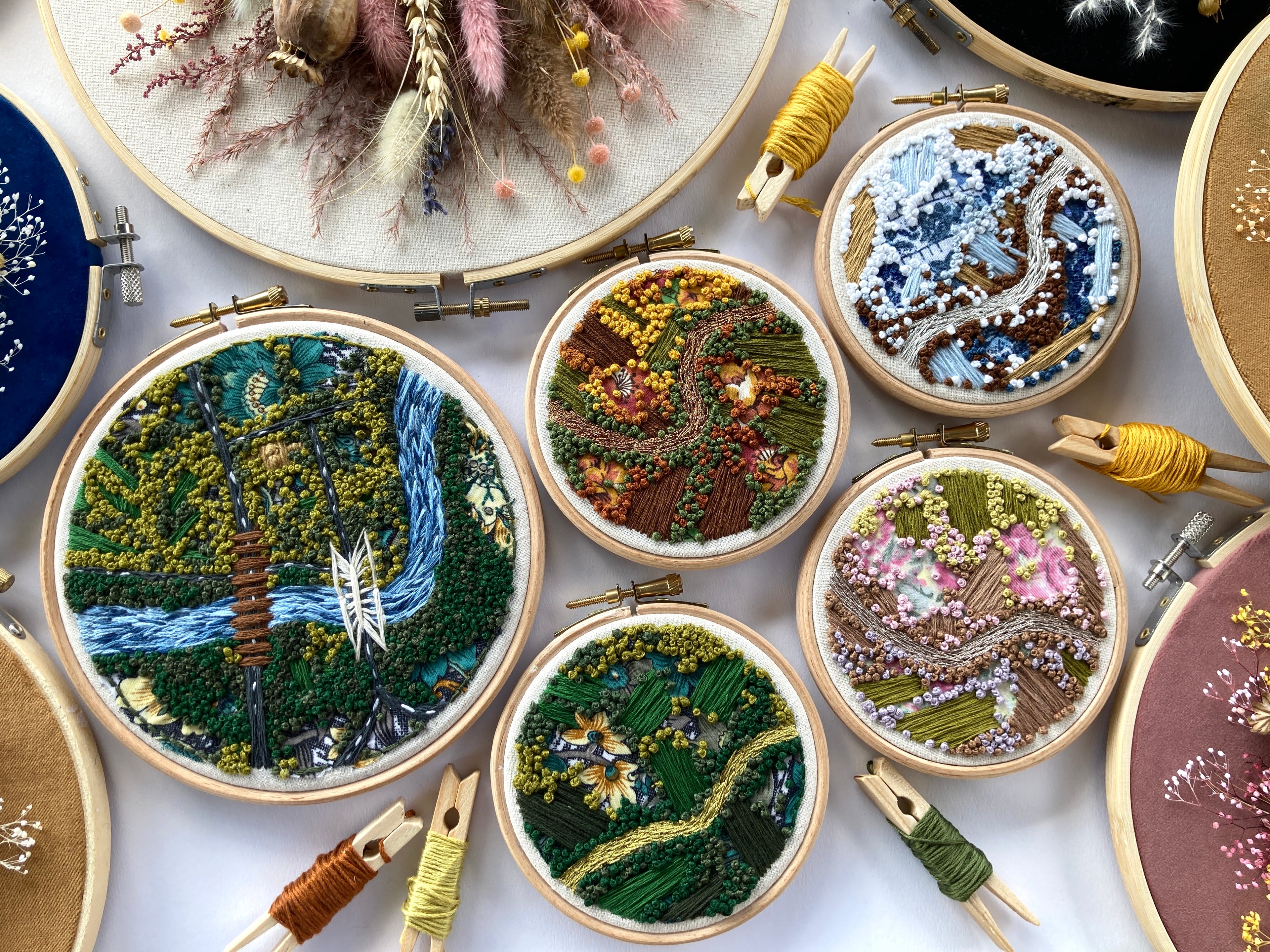 Original, hand-stitched embroideries combining modern embroidery, watercolour, calligraphy, mixed-media, and more