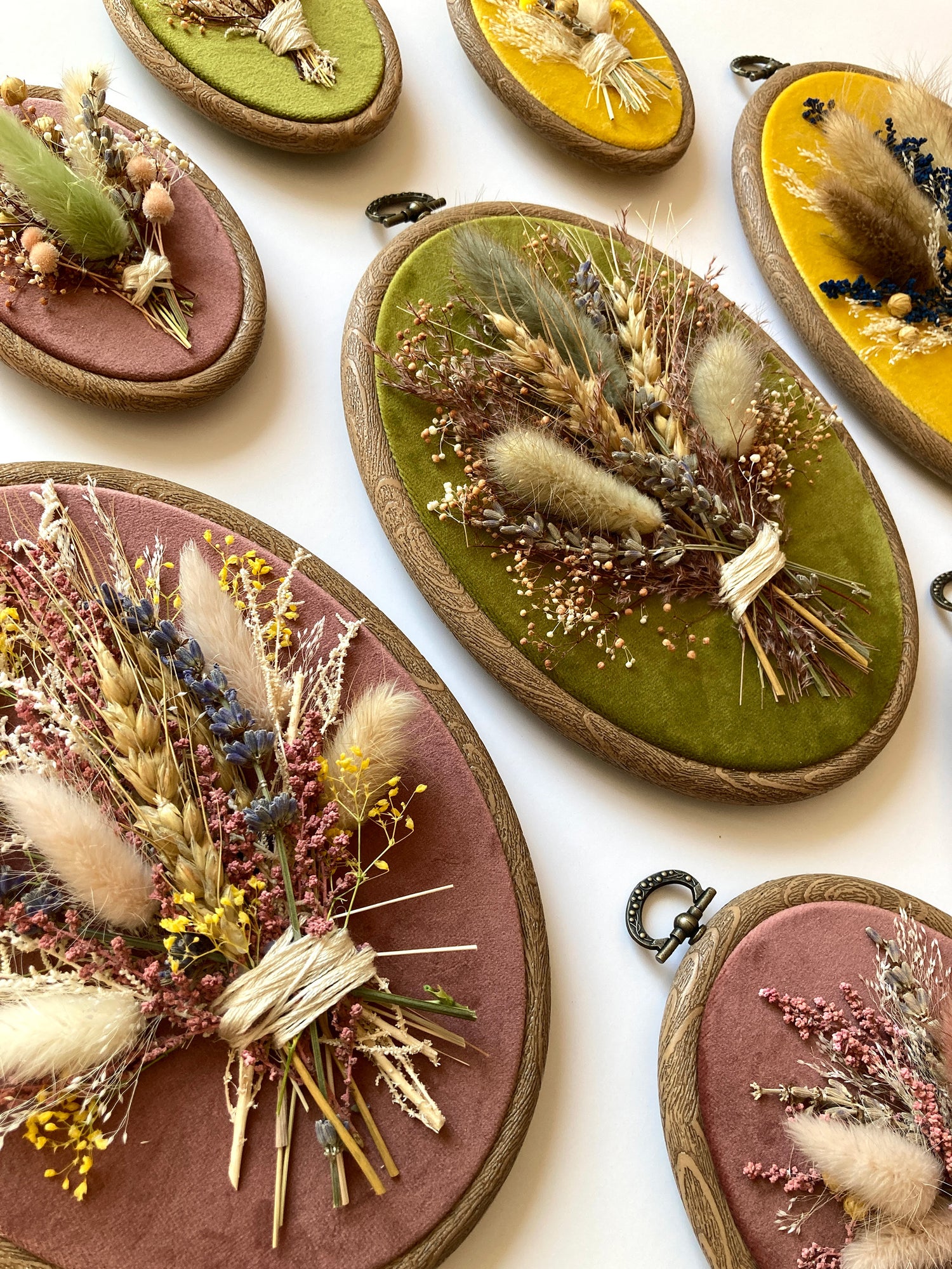 Real dried and preserved flowers carefully arranged by hand and then embroidered to the canvas. A gorgeous way to keep flowers in the house year-round and innovative way to gift flowers to your loved ones for any occasion!