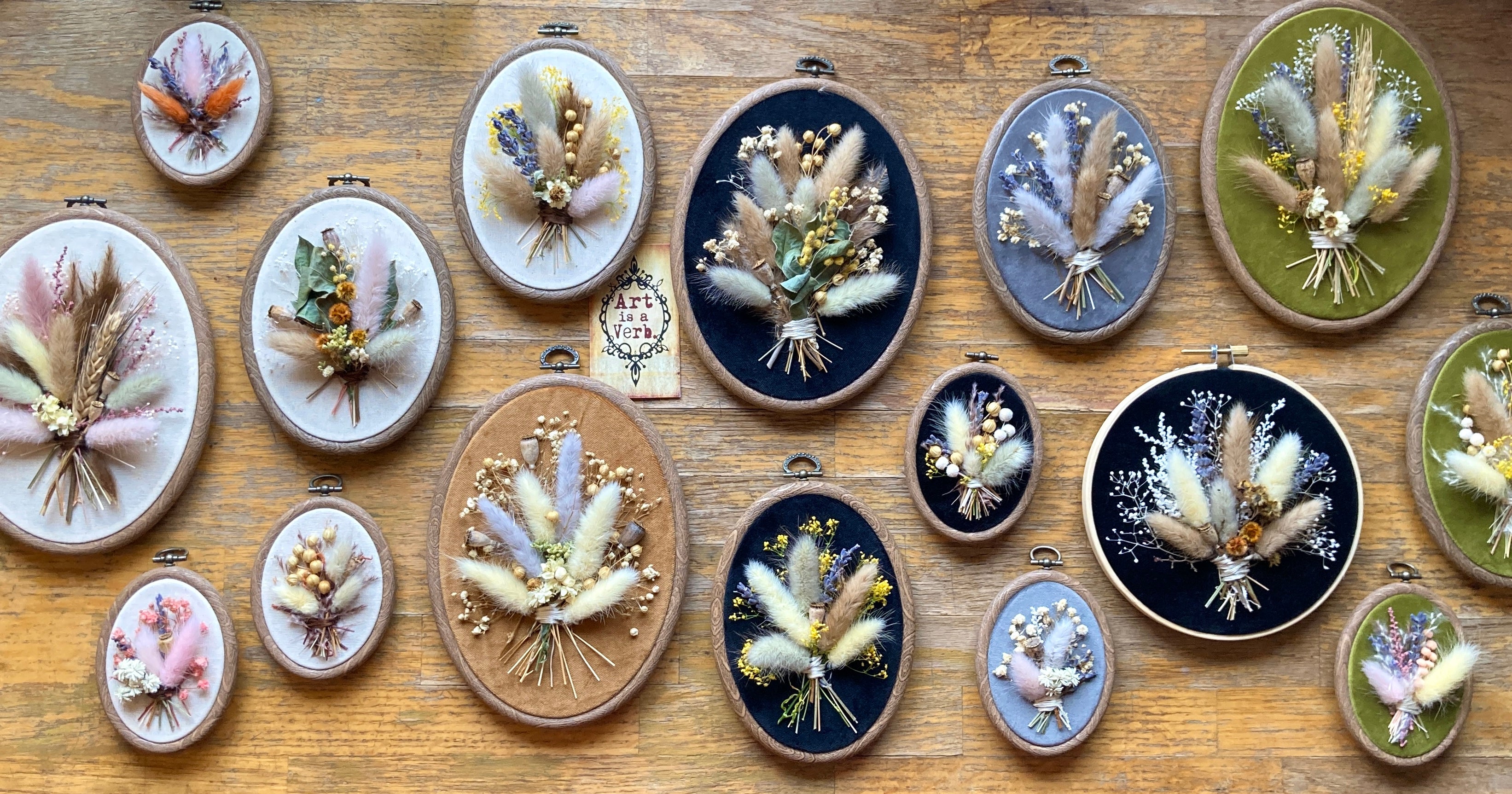 Neelam is the mixed-media visual artist behind Art is a Verb. As a South Asian woman, child of immigrants, Alberta-born, current Montréal-er, her work explores the places and identities she’s lived, a focus on hearth and home, a constant reverence for nature and its cycles, and a commitment to a “feminine is not frail” message. Neelam mixes historically domestic mediums like embroidery with dried flowers, watercolour, calligraphy, painting, drawing, collage, and more. Her art invites people to nest in their homes and transform their spaces into sanctuaries with her unique, grandma-chic, slow art.